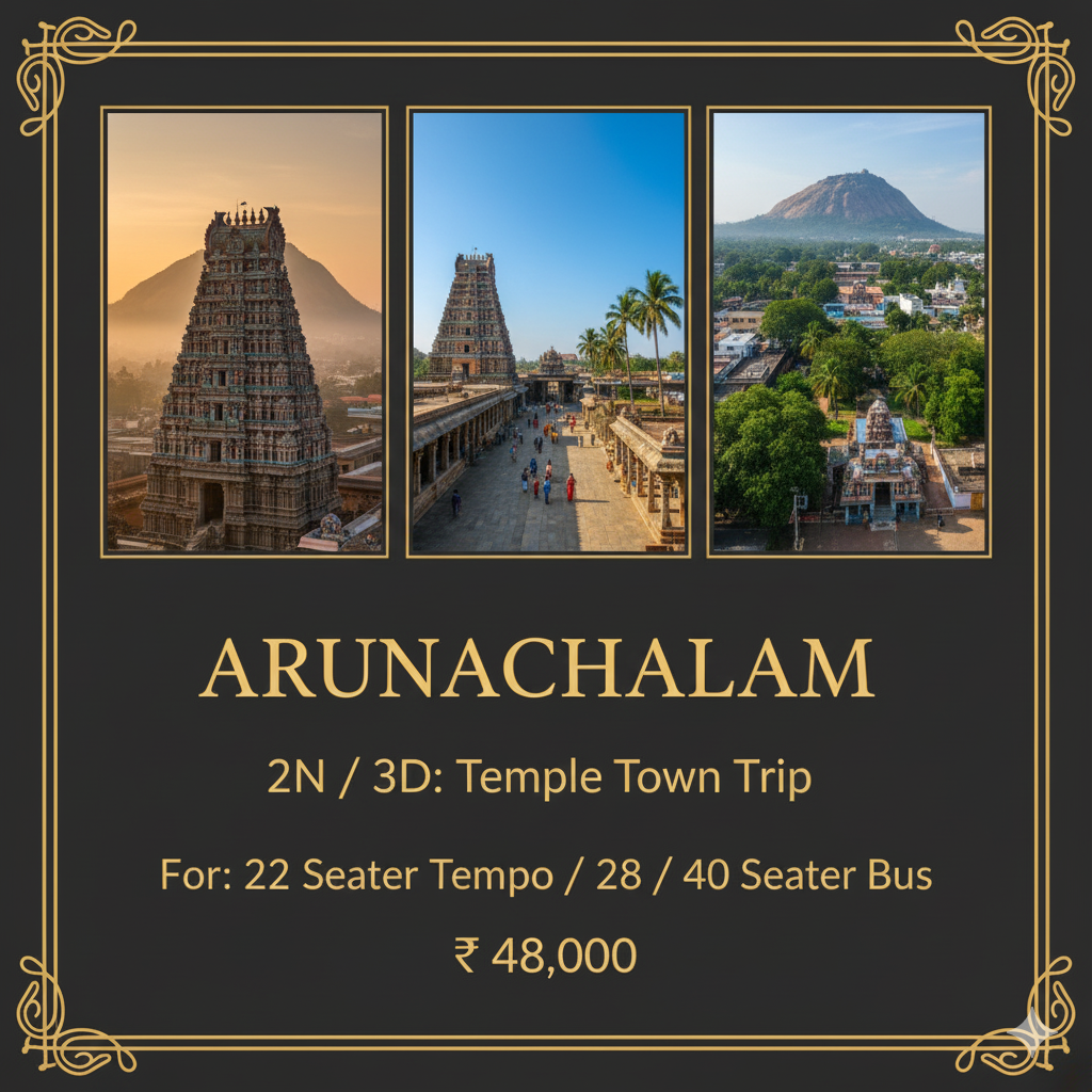 Arunachalam 2N/3D Temple Town Trip – Complete Travel Guide Arunachalam (Tiruvannamalai) is one of the most powerful spiritual destinations in South India and home to the sacred Arunachaleswarar Temple, dedicated to Lord Shiva in the form of Agni Lingam (Fire Element). Every month, thousands of devotees visit the temple for Darshan, Girivalam (Giri Pradakshina), meditation, […]